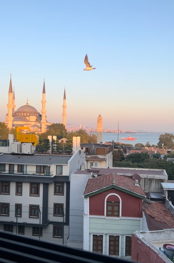 When we returned to Istanbul, D and I took the bus to our hotel that was located in Sultanahmet: the Hotel Uyan, which was conveniently located within walking distance from the Blue Mosque, Hagia Sofia, and the Topkapi Palace. It was a lovely hotel, and the room was spacious, clean and comfortable. We enjoyed our breakfast next to its rooftop terrace which offered a good view of the Blue Mosque and the sea. The hotel was next to famous rooftop restaurants which was circled by seagulls (I think this was their selling point to customers who go there for Instagram photos).