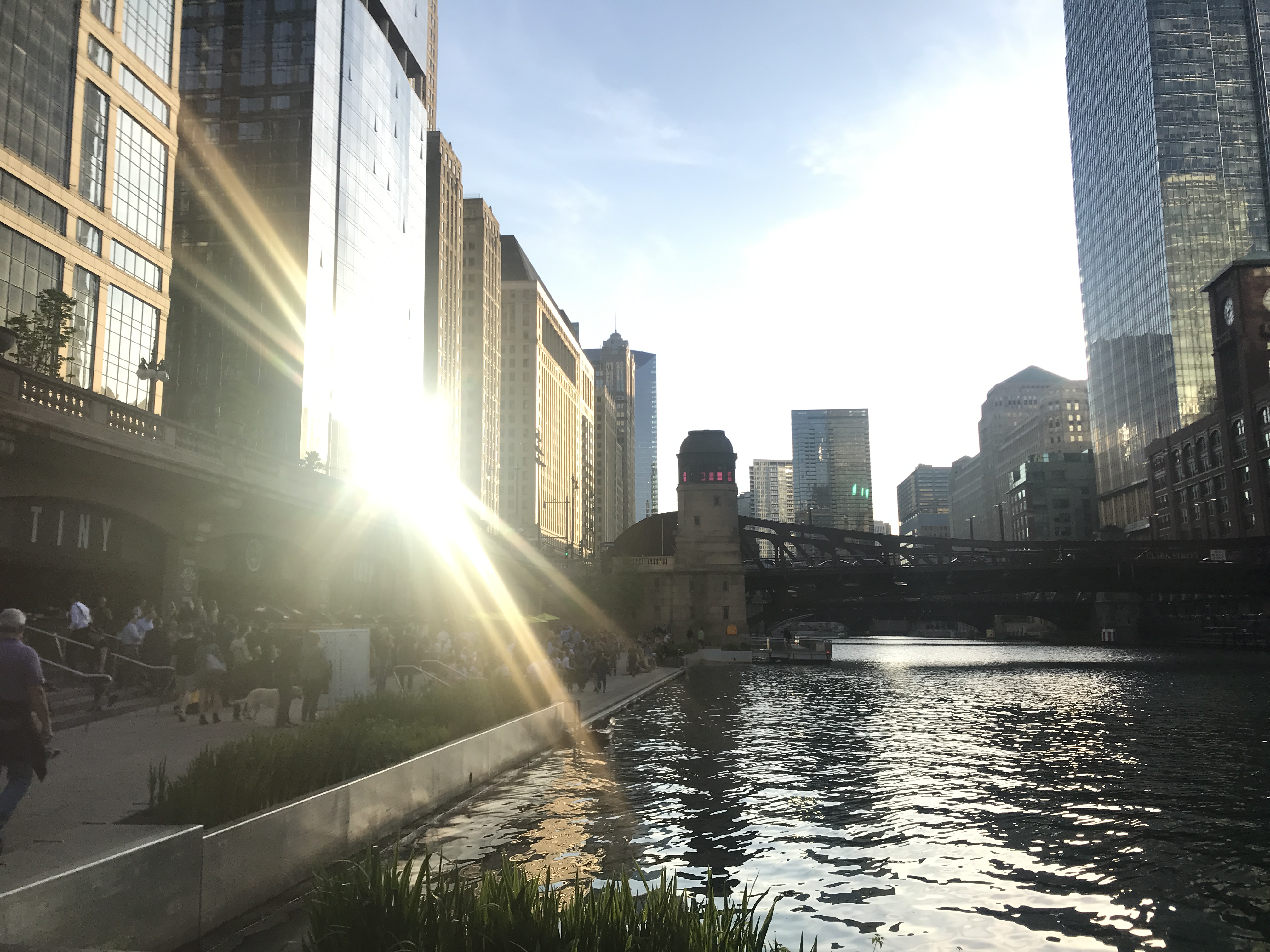 Reflection of the setting sun while walking along the river in Chicago, IL